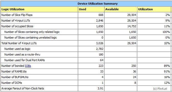 Below a short table of the FPGA utilization of the setup in TV/PAL mode. Including the VGA scan doubler it takes about 2000 Slice FF more for the required line buffer.
