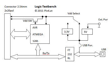 The general I/O voltage of 3.3V or 5V can be set up using a jumper. The USB serial connection is also available, it might come handy to extend the tester